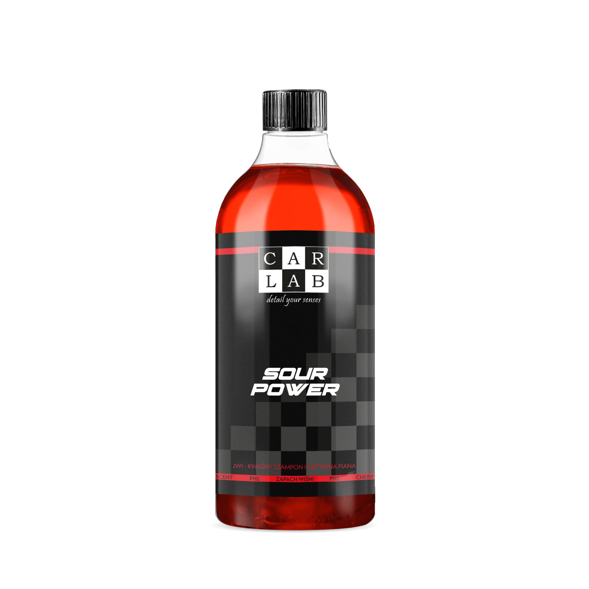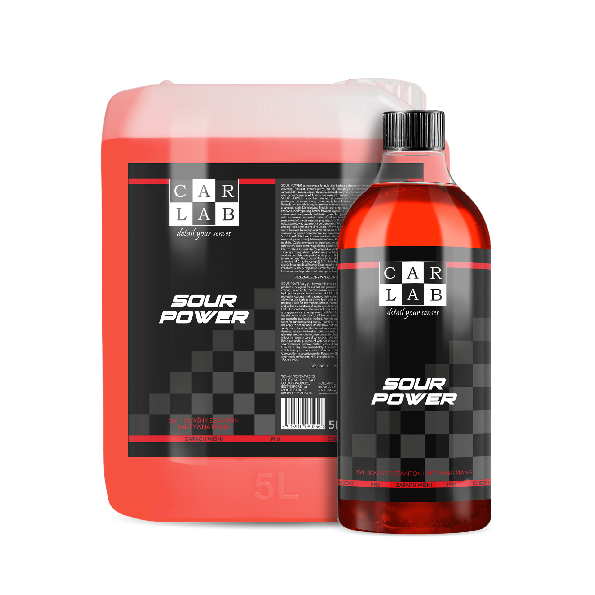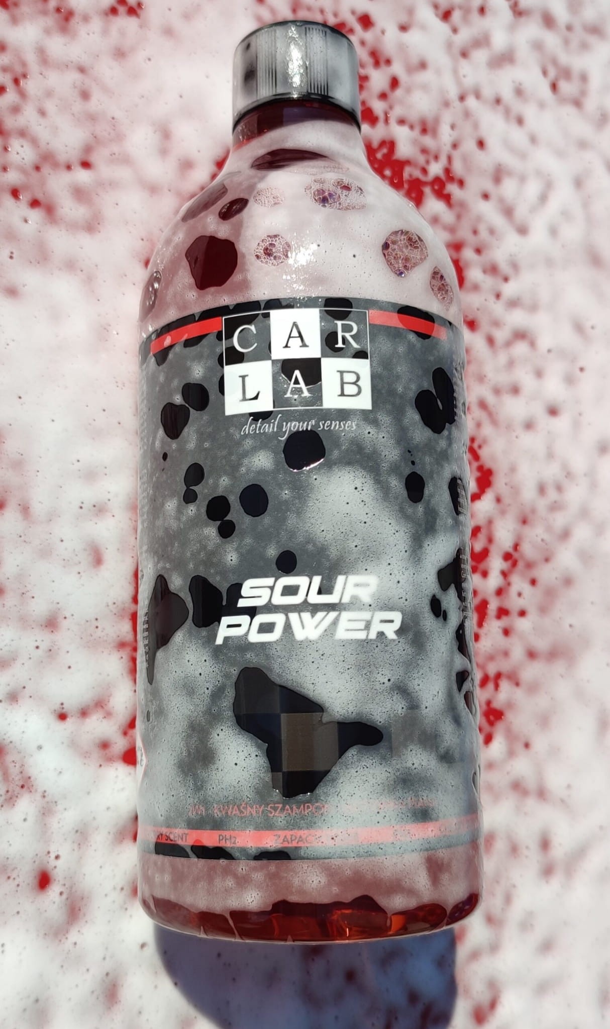 CARLAB SOUR POWER to najnowsza formuła 2w1 będąca połączeniem kwaśnego szamponu oraz piany aktywnej. Preparat przeznaczony jest do bieżącego oraz okresowego mycia w szczególności samochodów zabezpieczonych powłokami ochronnymi w celu usunięcia zanieczyszczeń mineralnych oraz przywrócenia powłokom ochronnym ich pierwotnych właściwości hydrofobowych i połysku. SOUR POWER może być również stosowany do mycia samochodów niezabezpieczonych powłokami ochronnymi oraz do usuwania lekkich waterspotów z lakieru i szyb samochodowych. Formuła 2w1 umożliwia użycie zarówno w formie piany aktywnej jak też w formie szamponu do mycia z użyciem gąbki lub rękawicy. Produkt jest bezpieczny dla mytych powierzchni, świetnie się pieni, zapewnia idealny poślizg, bardzo łatwo się wypłukuje i przeciwieństwie do preparatów o podobnym zastosowaniu nie posiada dodatków hydrofobizujących..