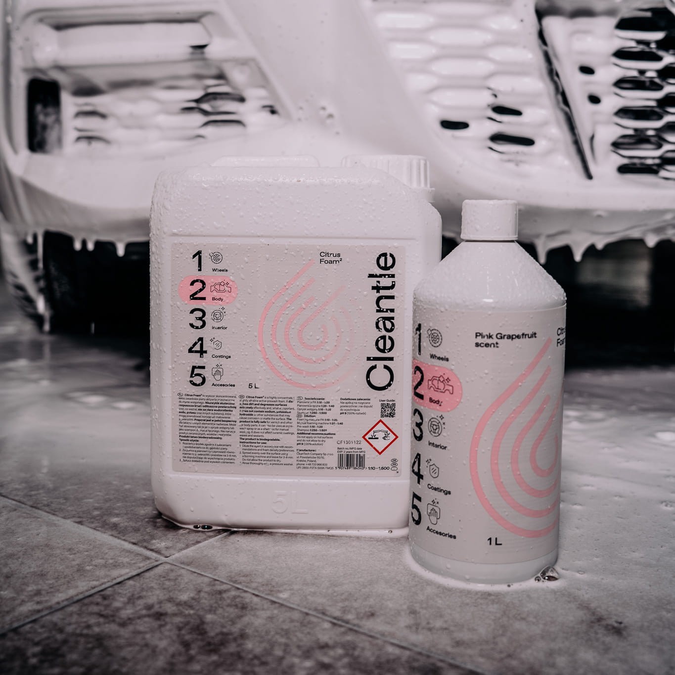 Citrus Foam² to wysoce skoncentrowana (pH 10 – 100% koncentrat) piana do mycia wstępnego o zapachu różowego grejpfruta. Preparat jest w pełni bezpieczny dla lakieru i innych elementów nadwozia. Ma wiele zastosowań. Nie narusza powłok ceramicznych, wosków i sealantów.