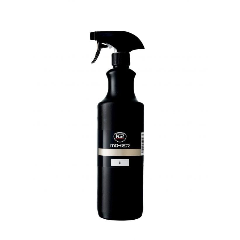 K2 MIXER to trwała, solidnie wykonana, pusta butelka z HDPE o pojemności 1 L. Przeznaczona do wszelkiego rodzaju produktów, kwasowych i zasadowych. Jej ergonomiczny kształt zapewnia komfortową pracę, a przeźroczysta miarka pozwala na wygodne kontrolowanie pozostałej ilości produktu oraz ułatwia przygotowanie roztworu. Nowy ulepszony trigger posiada 2 funkcje - mgiełki oraz strumienia punktowego.