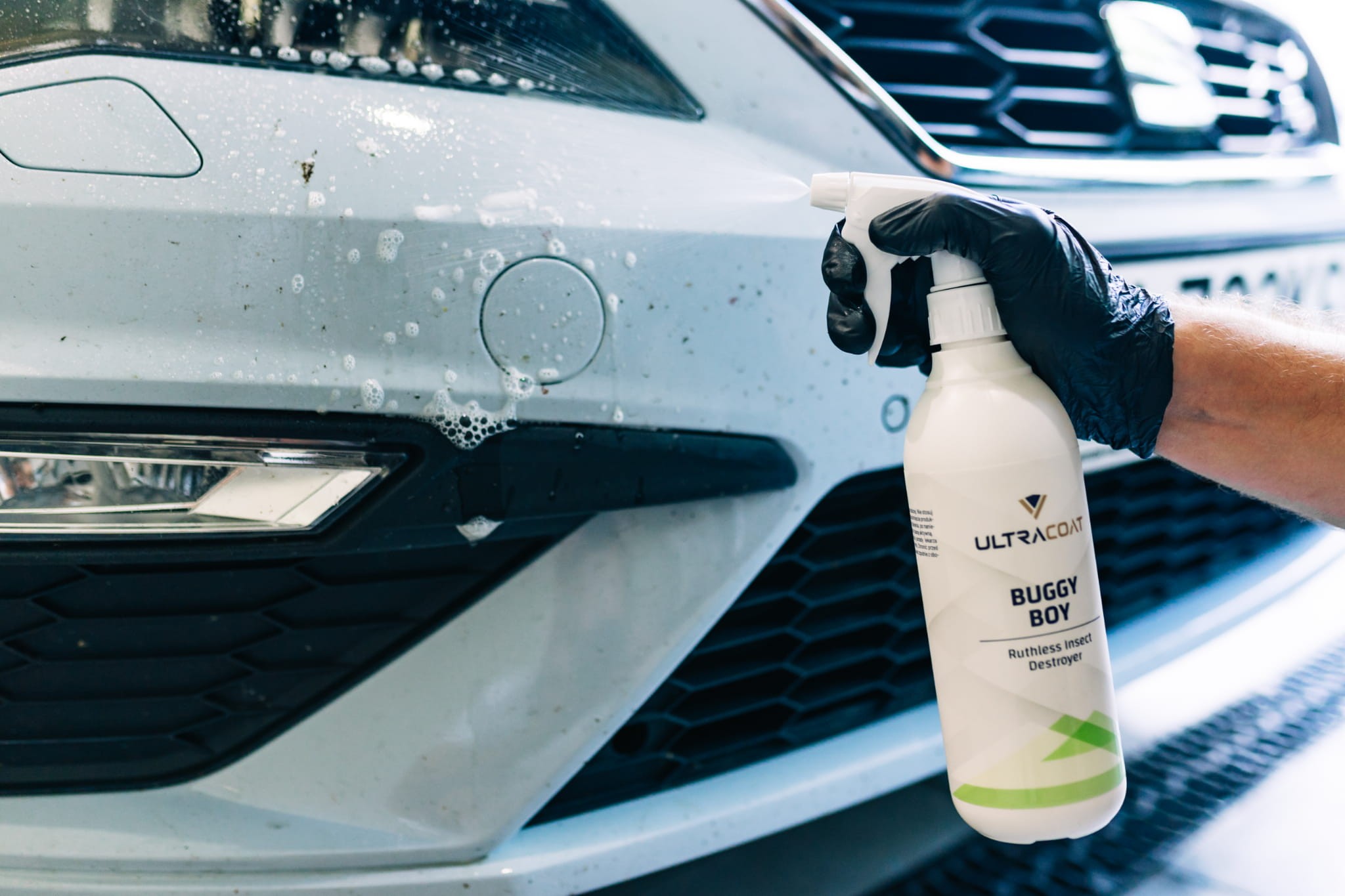 Z myślą o trudnych zabrudzeniach lakieru stworzyliśmy preparat Buggy Boy – Ruthless Insect Destroyer. To środek do usuwania owadów i innych zabrudzeń organicznych z karoserii, lamp, szyb i plastikowych elementów auta.