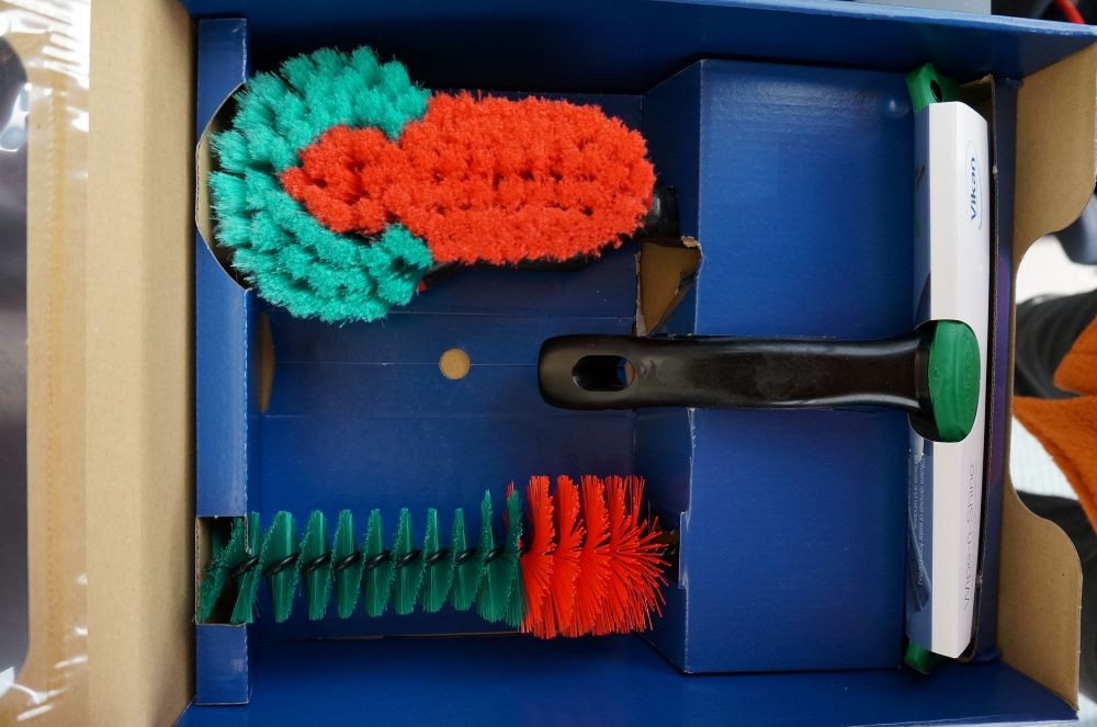 - Zestaw zawiera: 1 x 524652 szczotka ergonomiczna, ręczna z miękkim włosiem i gumowym rantem, 1 x 525352 szczotka spiralna do czyszczenia felg, 1 x 707752 ściągaczka do wody 25cm.