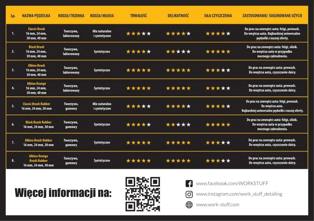 Przedstawiamy naszą szczoteczkę Detailing Brush SHORT – ostateczne narzędzie do czyszczenia samochodu. W trzech rozmiarach (16, 24 i 30 mm), czarnym lakierowanym plastikowym uchwytem i mieszaniną naturalnych i syntetycznych włókien, ta szczotka doskonale nadaje się do czyszczenia obręczy, wstępnych prań i wnętrz samochodów. Krótsze włókna niż w wersji CLASSIC zapewniają jeszcze bardziej skuteczne doświadczenie czyszczenia. Zamów już dziś i poczuj różnicę!